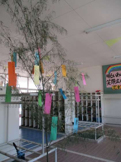 地域の方から、大きな笹をいただきました。児童玄関に飾り、短冊を付けてます。明日には、子どもたちのお願い事や飾りでいっぱいになりそうです。