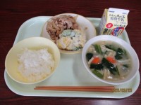 菜めし  牛乳  はりはり和え  みそ汁  ◆豚肉の香り揚げ  ◆白身魚のフライ  ○メロンクリームソーダゼリー  ○ブルーベリータルト