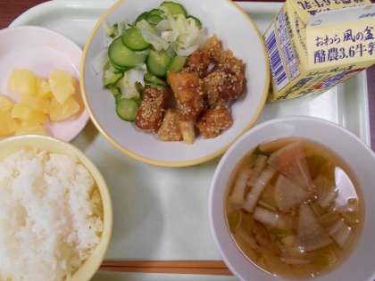 ごはん 牛乳 豚肉の甘みそからめ きざみ和え すまし汁 パイン