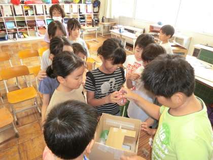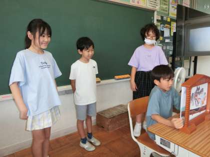 クイズ係は、ダンボールでガチャガチャマシンをつくり、楽しいクイズ大会を開きました。