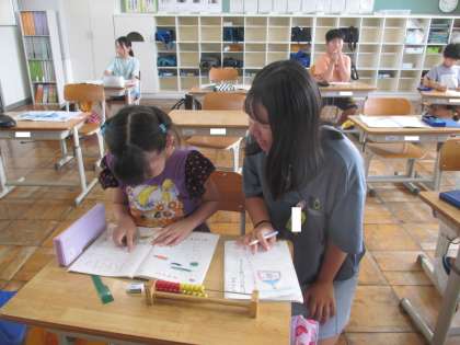 【写真上】今日の学習相談日では、登校した子どもたちが縦割りグループになって教室に分かれ、持参した宿題や自主学習等に取り組んでいました。それぞれの教室では、高学年が下学年からの質問に対して優しく教えている姿が見られ、船峅っ子の優しさが溢れていました。