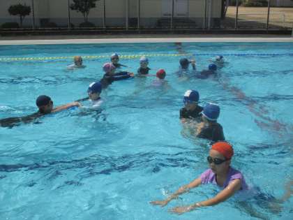 【写真下】今日は夏休みに入ってから初めてのプール開放でした。日差しが照りつける中、多くの子どもたちが冷たいプールで楽しそうに泳いでいました。