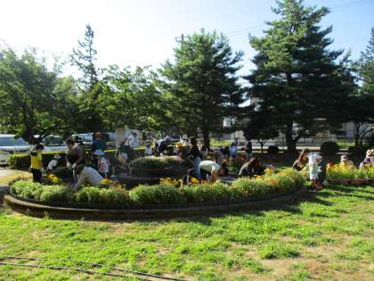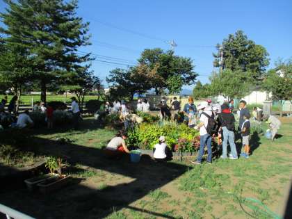 1〜4年生の子どもたちと保護者の皆さんは、前庭の花壇の草むしりを行いました。とてもすっきり、きれいになりました。