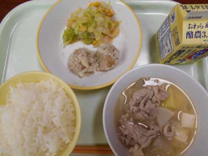 <今日の献立> ごはん 牛乳 珍珠丸子(チンズワンズ) コーン和え さつま汁