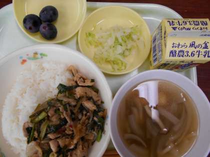 ごはん  牛乳  豚キムチ丼  ゆでキャベツ  茎わかめスープ  巨峰