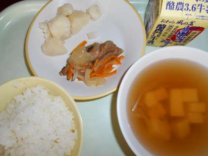 <今日の献立> ごはん 牛乳 ふくらぎのマリネ こふきいも すまし汁