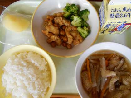 <今日の献立> ごはん 牛乳 鶏肉とひよこ豆の甘からめ ゆでブロッコリー 沢煮椀 冷凍りんご
