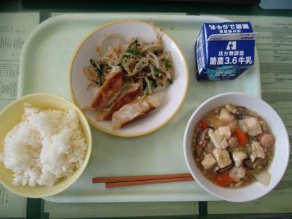 <今日の給食> ごはん 牛乳 焼きぎょうざ ナムル えびと豆腐のうま煮