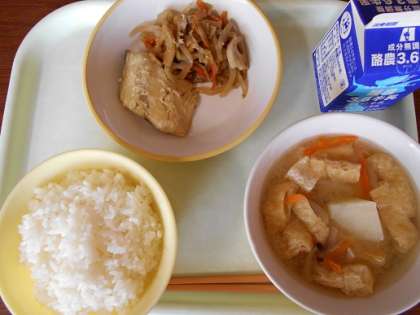 <今日の献立> ごはん 牛乳 さばの塩焼き きんぴら 五目みそ汁