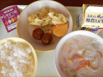 10月13日(金) 今日の給食 公開日 2023/10/13 更新日 2023/10/13 今日の船峅っ子 <今日の献立> ごはん 牛乳 ミートボール チーズおさつ 豆乳野菜スープ 柿 しそかつおふりかけ