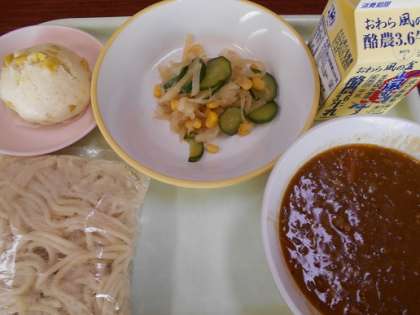 <今日の献立> ソフト麺 牛乳 ソフト麺のカレーソース 蒸しパン 大根サラダ