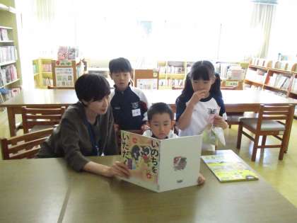 「続きを知りたい!」と、低学年の子どもたちが早速図書室を訪れ、今日紹介された本を、司書の先生に読み聞かせをしてもらっていました。