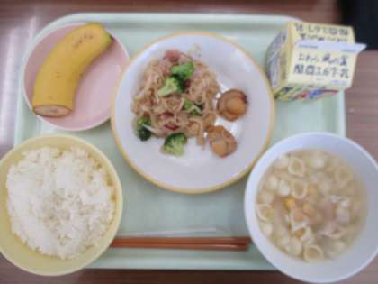 切り干し大根のペペロンチーノ  マカロニスープ  バナナ