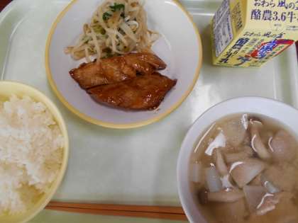<今日の献立> ごはん 牛乳 赤魚の照り焼き 香味和え いものこ汁