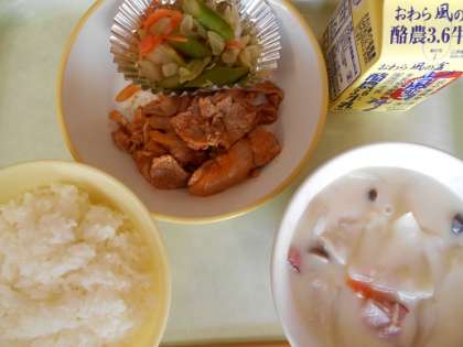 <今日の献立> ごはん 牛乳 ポークチャップ アスパラサラダ 秋の香りシチュー