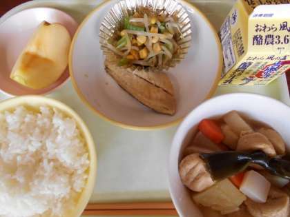 <今日の献立> ごはん 牛乳 鰆の幽庵焼き コーン和え おでん りんご