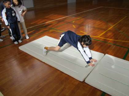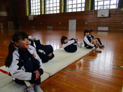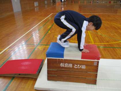 先月実施した跳び箱教室でのことを思い出しながら、手の付き方、重心の移動の仕方に気を付けてとびばこ遊びをしました。「またやりたい」「もっと遠くに足がつくようにしたい」「〇〇さんのように飛び越しができるようになりたい」と、意欲的な言葉が聞こえてきました。