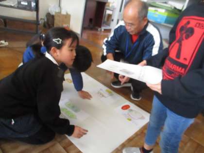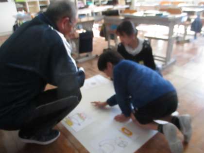 3年生は、国語科「すがたをかえる大豆」の学習に取り組んでいました。一人一人が画用紙にまとめたものを1枚の大きな紙にどのようにはろうかと相談しているところでした。