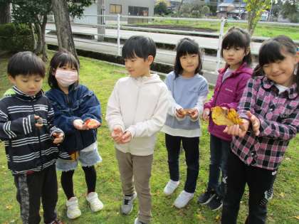 「はっぱがカサカサしているよ。やぶれやすくなっているよ。」「はっぱの色がみんなちがうよ。」「まつぼっくりを上から見たら、バラの花みたいだよ。」など、さまざまなことに気づきました。