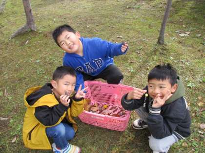 花壇の周りにある落ち葉やまつぼっくりを拾いました。