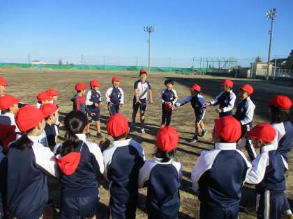 赤団と白団の対抗戦です。走る前に、みんなで気合いを入れています。