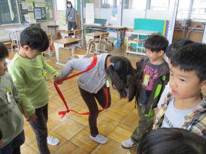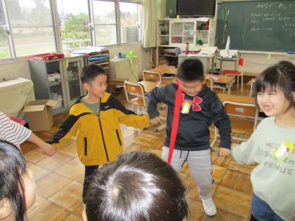 11月17日 みんなで「わ」くぐり 公開日 2023/11/17 更新日 2023/11/17 1年生 全員で円になって手をつなぎ、フラフープやたすきを使って手を離さないようにしながら輪くぐりをしました。「ひっかかると動きがおもしろくなって楽しかった」「うまく通るように手伝ってもらえてうれしかった」「たすきのほうが難しかったけれど、難しいほうが楽しかった」「うまく通るように助けられてよかった」と、感想をたくさん話すことができました。