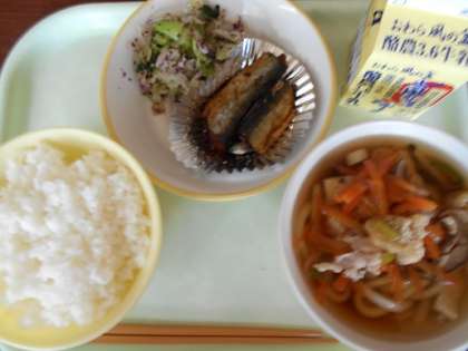 <今日の献立> ごはん 牛乳 いわしの生姜味 ゆかり和え 五目うどん