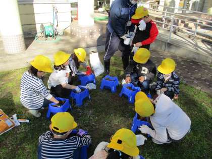 アサガオを育てていた植木鉢に、チューリップの球根を植えました。学校花壇から掘り上げた球根なので、何色の花が咲くのか、咲いてみないと分かりません。どきどきしながら、くじ引きのように球根を選んで植えました。