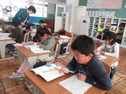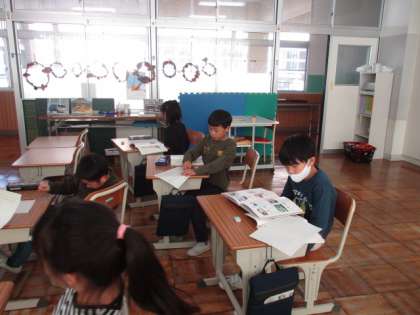 1年生は、「じどう車くらべ」の学習に取り組んでいます。教科書の本文から、「しごと」と「つくり」を読み取り、ワークシートに書いていました。