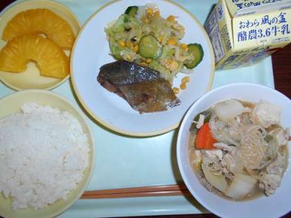 ごはん  牛乳  鯵のみりん焼き  コーン和え  鶏すきやき  パインアップル