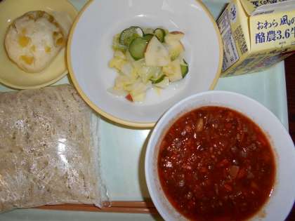 <今日の献立> ソフト麺 牛乳 ソフト麺のミートソースかけ 蒸しパン 白菜とりんごのサラダ