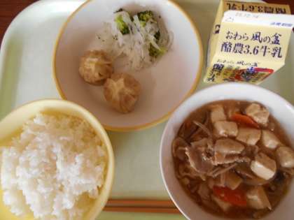 ごはん(有機米) 牛乳 小籠包 大根とブロッコリーのえごまサラダ 豆腐ときのこのあんかけ煮