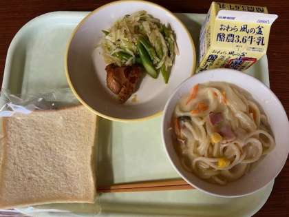 <今日の献立> 食パン(減) 牛乳 照焼きチキン 切干大根のサラダ クリームスパゲッティ