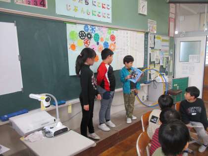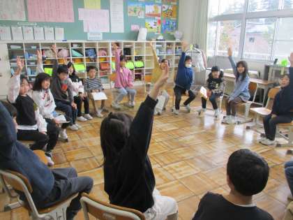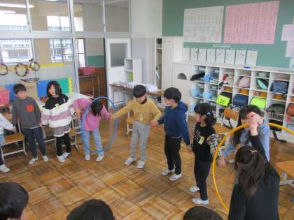 1年生は、初めて自分たちで学級集会を開きました。2年生を招待し、楽しくクイズや輪くぐり、何でもバスケットなどをしました。