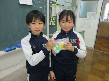 3年生が、育てていたオクラから採れた種を全校児童に分けてくれました。1人分ずつきれいに個装されているものを受け取り、「いつうえようか」「10つぶある」と言って喜んでいました。