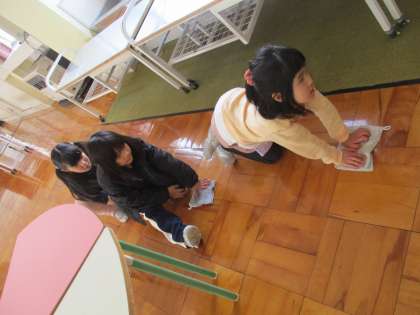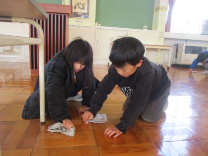 12月21日 1年生 大そうじ 公開日 2023/12/22 更新日 2023/12/22 1年生 今日は、全校でランチルームの水拭きの日でした。1年生は、自分たちの席や、ランチルームの端を拭きました。