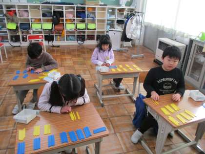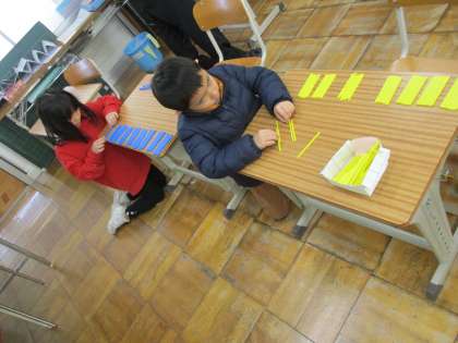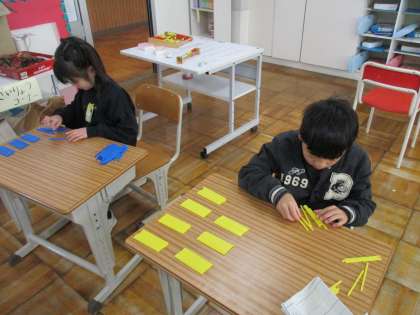 百本近い数え棒を数えました。前回は、1本ずつ続けて数えていた1年生。「何本だったか、とちゅうで分からなくなる」「話しかけられたらもう一度数え直しになる」と困っていたところ、「10本ずつまとめるといい」という意見が出ました。