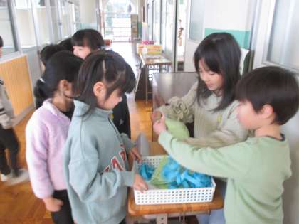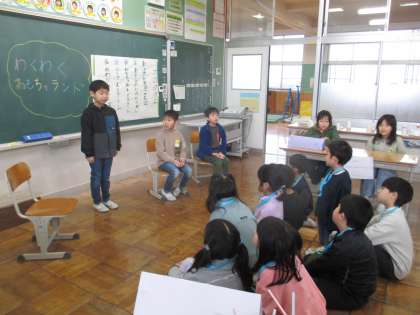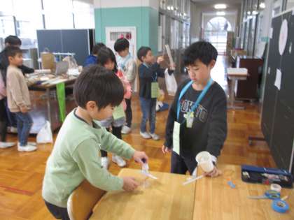 生活科の学習では、2年生が1年生を「わくわくおもちゃランド」に招待しました。これまでの学習で試行錯誤を重ねて作ったおもちゃを1年生に楽しんでもらうために、遊び方を工夫したり、手作りの景品を用意したりと多くの工夫が見られました。今後も1、2年生の交流を通して、さらに仲を深めていきたいものです。