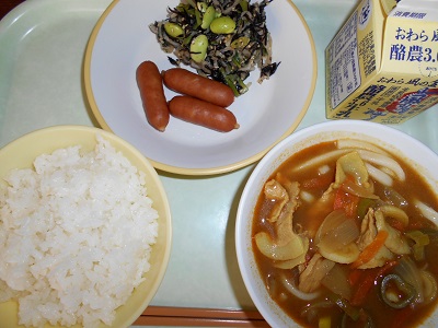 ごはん 牛乳 あらびきウインナー 鉄たっぷりサラダ スタミナカレーうどん