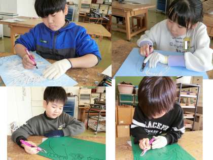 3年生は、自分が好きな日本の昔話の世界を、4年生は、自分の好きな動物の力強さを表現しようと版を彫り進めています。