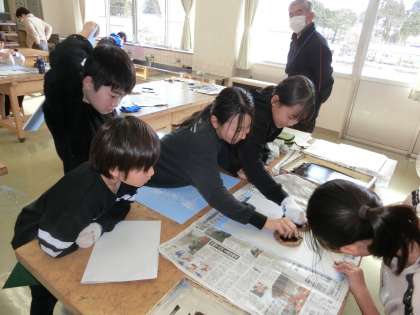図工の時間に版画の学習に取り組んでいる3・4年生。