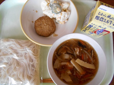 【今日の献立】 ソフト麺 牛乳 ソフト麺の五目あん 鶏つくね ポテトサラダ