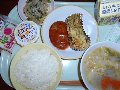 ごはん 牛乳 魚の磯辺揚げまたはハンバーグのケチャップ煮 はりはり和え 具だくさん汁 もものタルトまたはみかんババロア