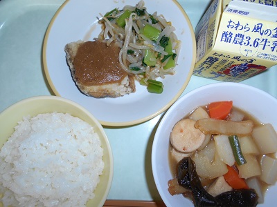 【今日の献立】 ごはん 牛乳 魚の甘みそかけ おひたし 関東だき