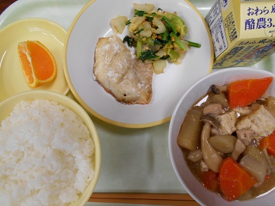 ごはん  牛乳  赤魚の塩焼き  いり大豆和え  根菜のごま煮  清見オレンジ