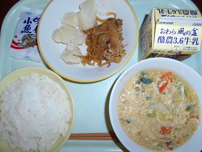 【今日の献立】 ごはん 牛乳 豚肉のキムチ炒め こふきいも 中華かきたま汁 味付け小魚