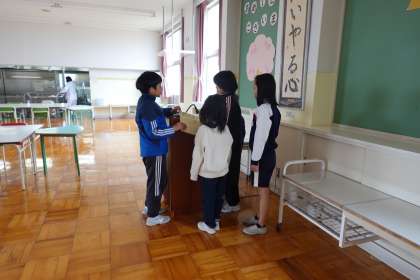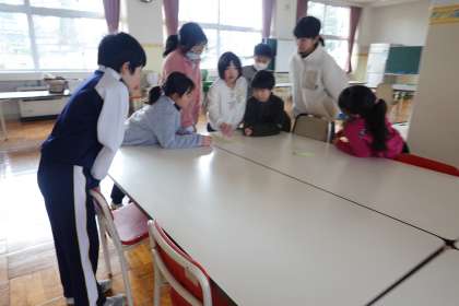6年生が、事前に校内のいたるところにカードを貼り、班ごとに協力してそれを「宝探し」しました。
