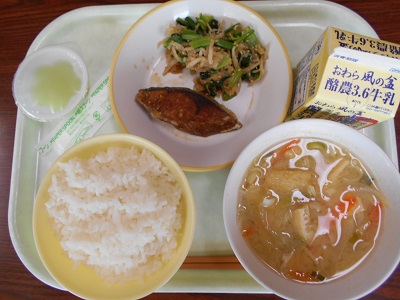 【今日の献立】 ごはん 牛乳 ふくらぎのかば焼き はりはり和え 五目汁 青リンゴゼリー
