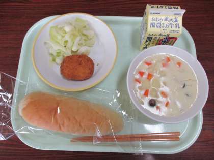 <今日の献立> コッペパン 牛乳 豆とかぼちゃのコロッケ ピクルス クリームチャウダー