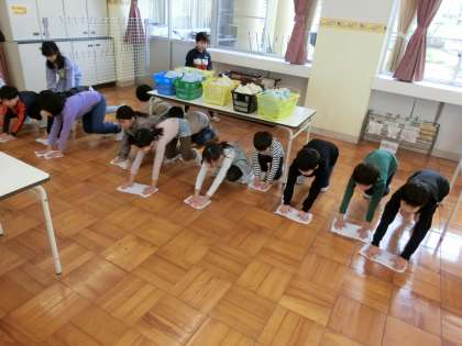 3・4年生は、朝のそうじの時間にランチルームに向かい、ランチルームの床をきれいに拭きました。